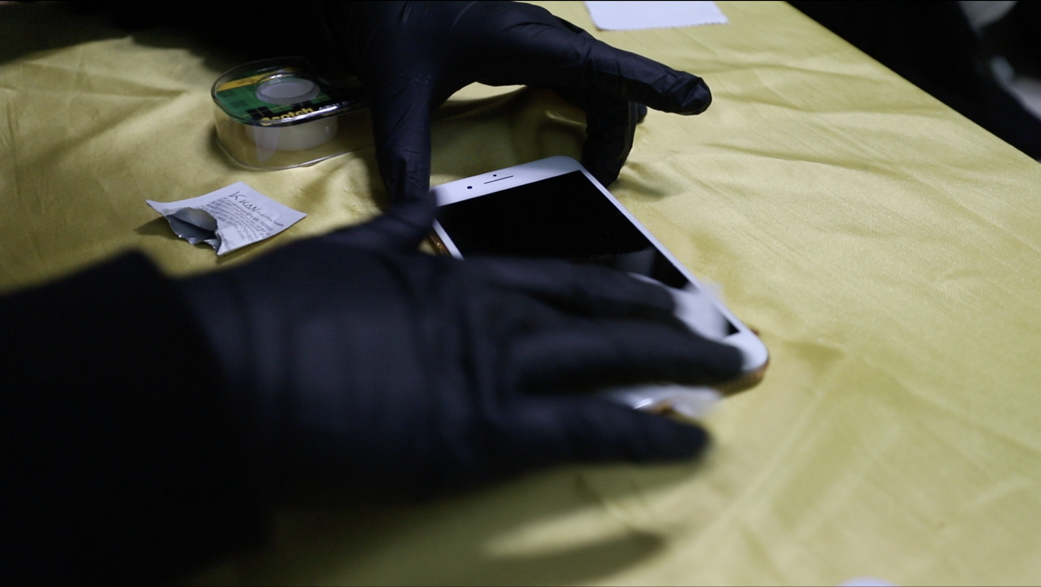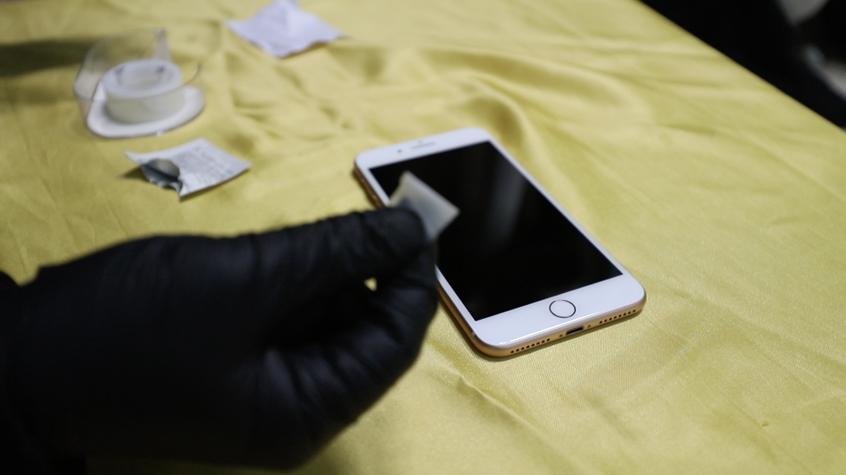 여기가 핵심이에요. 테이프를 조금 뜯어서 말아주세요. 그다음 잘 닦은 스마트폰 위에 올라와 있는 작은 먼지들을 톡톡 제거해줍니다. 하얗고 작은 먼지들이 안경닦이로 닦아도 위에 올라와 있는 경우가 많아요. 이걸 제거하지 않고 붙이게 되면 강화유리 안에 하얗게 기포가 있는 현상이 발생합니다. 아주 눈엣가시겠죠? 그래서 방 안에 먼지가 덜 달라붙도록 습기가 많은 곳이 좋아요. 솔직히 말하면 샤워하고 10분 정도 지난 화장실에서 붙이는 게 최고예요.