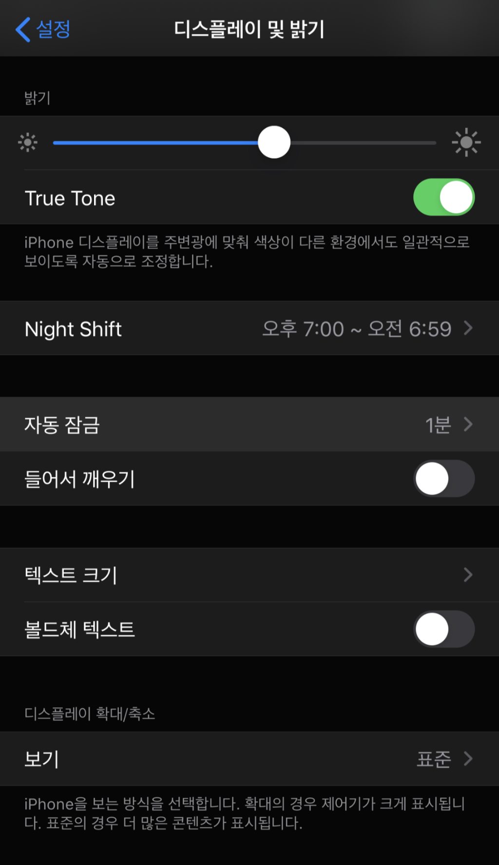 iOS 13부터 새롭게 생긴 기능이 있어요. 다크 모드. 요즘 나오는 iPhone의 경우에는 다크 모드가 배터리 수명 절약에 도움이 된다고 합니다. 과거 iPhone과 탑재하고 있는 디스플레이가 다르기 때문이에요. OLED. 바로 요즘 나오는 iPhone에 들어가는 디스플레이입니다. 물론, OLED 탑재 이전 스마트폰도 다크 모드의 효과가 없지는 않아요. 다크 모드 활성화는 설정>디스플레이 및 밝기> 다크 모드 옵션 탭. '자동'을 선택할 경우에는 각 날의 일출 및 일몰 시간에 맞춰서 자동으로 다크 모드가 비활성/활성 상태가 됩니다.