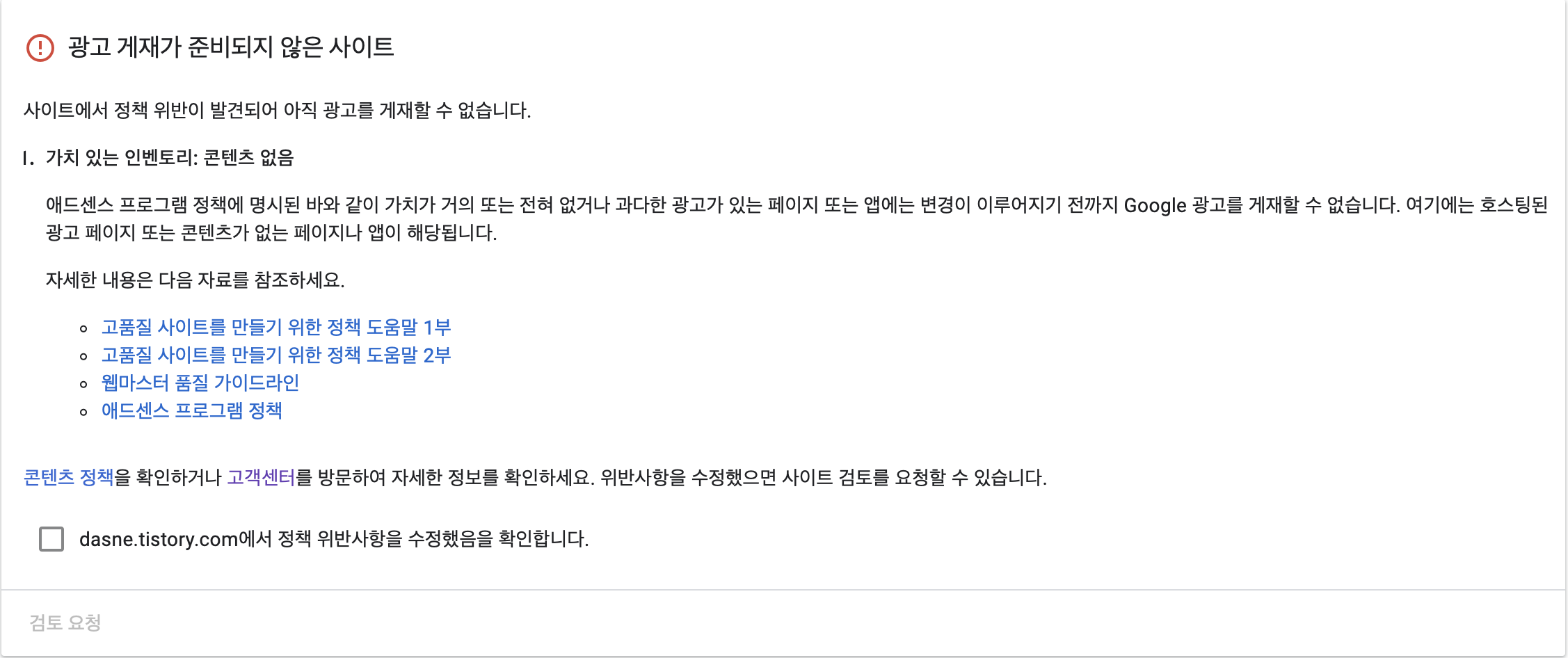 아니요. 불합격 메일이 15일이나 걸려서 왔어요. 나름 1 일 1 포스팅을 꾸준하게 해왔기 때문에 어느 정도 기대했었습니다. 하지만 역시 애드 고시의 벽은 높은 것 같아요. 사이트로 들어가면 왜 애드센스 승인을 받아들이지 않았는지에 대한 이유가 적혀있겠죠. 검토하는 시간이 길어져 '불합격'이라고 예상은 했는데, 막상 이 메일을 받으니 조금 아쉬운 마음이 크네요. 하지만 어떤 문제가 있었고, 앞으로 어떻게 수정해야 할지 깊게 고민해봐야겠죠? 우선, 구글에서 알려준 문제가 뭔지 살펴볼게요.