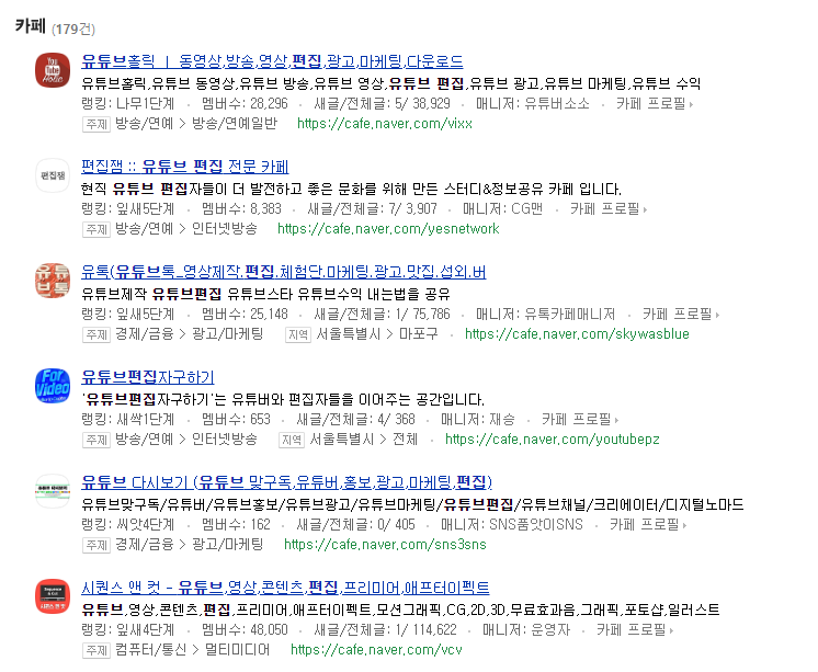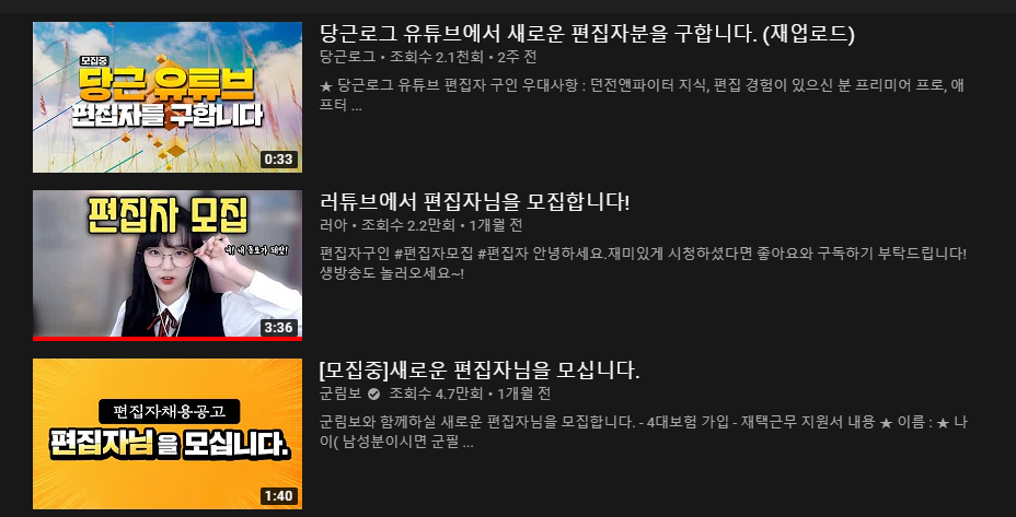 이 외에도 각종 네이버 카페나 단체 오픈 채팅 방 등 다양한 곳에서 활동하면 쉽게 일을 구할 수 있어요. 특히, 요즘은 유튜브에서 공개적으로 편집자를 구하는 일이 많습니다. 때문에 자신이 자주 보는 크리에이터의 편집을 구하게 된다면 더 재미있게 일을 할 수 있어요. 물론, 포트폴리오가 없는 이제 입문하는 분들에겐 어려운 방법이죠. 그렇기 때문에 자신의 유튜브를 직접 운영하면서 편집 포트폴리오를 만들어 두는 게 정말 좋은 방법이에요.