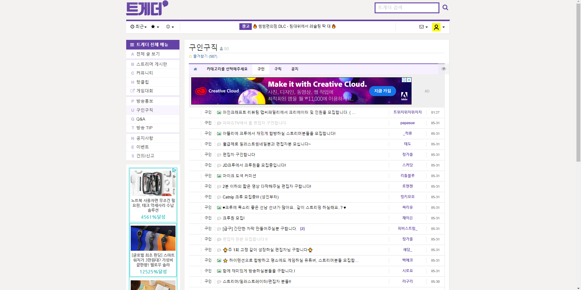 트게더는 트위치 TV에서 활동하고 있는 많은 스트리머들이 이용하고 있는 사이트예요. 이곳에서는 유튜브와 트위치 스트리밍을 함께 성장시키기 위해 많은 편집자를 구하고 있어요. 과거에는 구직보다 구인 비율이 훨씬 많았던 사이트입니다. 하지만 지금은 제대로 된 구인을 찾기 오히려 힘든 곳이죠. 여전히 트위치 tv의 많은 스트리머 분들이 턱 없이 낮은 가격으로 편집자를 구하고 있기 때문입니다. 물론, 입문 편집자도 그만큼 쉽게 경력을 쌓을 수 있죠.