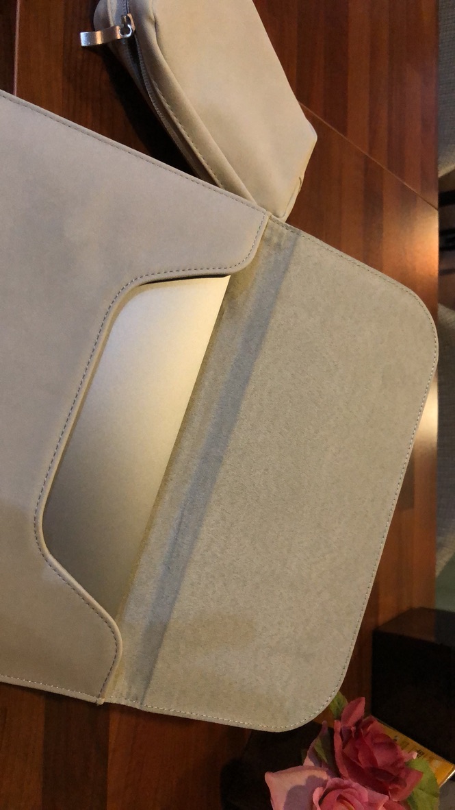 애플의 사과 로고를 파우치에 각인한 것은 정말 신의 한 수였어요. 애플의 정품 파우치처럼 느껴지지 않나요? 라이트 피플 파우치 자체가 스웨이드 겉감으로 이루어져 있어서 더 정품 파우치처럼 보이는 것 같아요. 그런데, 아쉬운 점은 바로 추가로 주문했던 포켓 파우치예요. 내부가 조금 아쉬운데요. 한 마디로 설명하면 학생 때 자주 쓰던 필통 속 느낌이랄까요? 개인적으로 내부가 이렇게 비닐 느낌의 빛이 나는 재질로 되어 있는 걸 별로 좋아하진 않습니다. 나름 깔끔하고 무난하지만 고급스러운 외부에 비하면 조금은 아쉬운 부분이죠.
