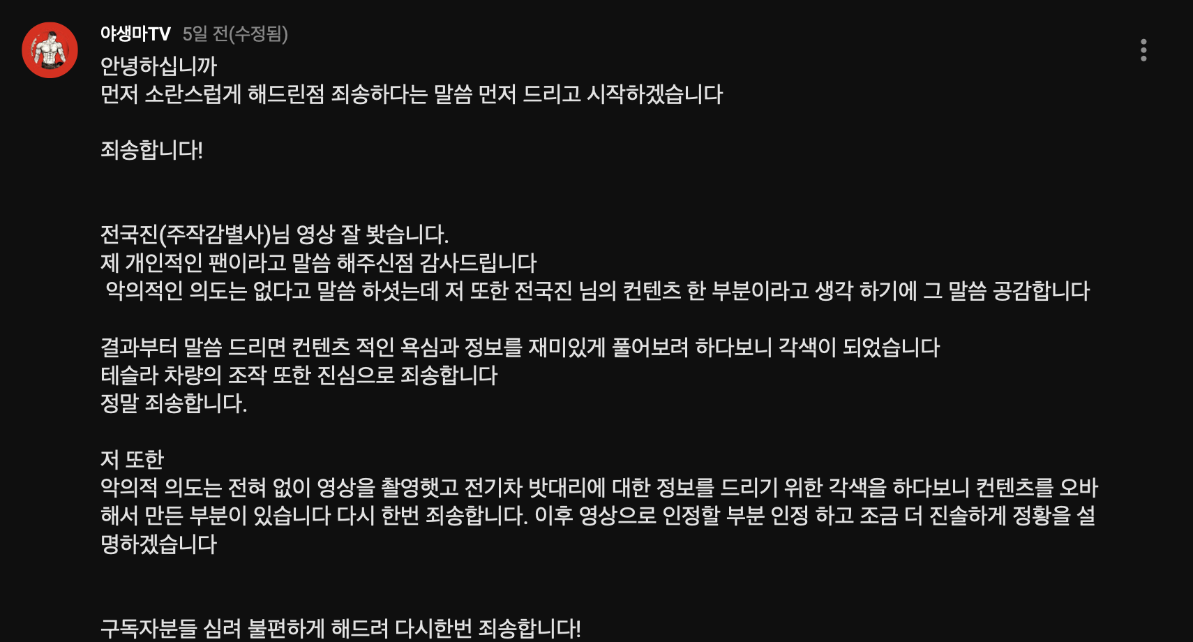 최근 들어 시청자들을 기만하는 유튜버들이 많은데요. 이들은 모두 그 실태가 드러났고, 대중들로부터 많은 비난을 받고 있습니다. 이 와중에 이번에는 세계적인 기업인 '테슬라'를 저격해버린 대단한 채널이 나왔는데요. 바로, 40만 구독자를 보유한 야생마TV에요. 야생마(본명 주경진)는 '배터리가 조루인 테슬라?! 잘못된 상황입니다'라는 제목의 콘텐츠를 자신의 채널에 업로드했었어요. 물론, 지금은 삭제됐어요. 저 콘텐츠를 연출된, 주작된 콘텐츠였다고 밝혀졌거든요.