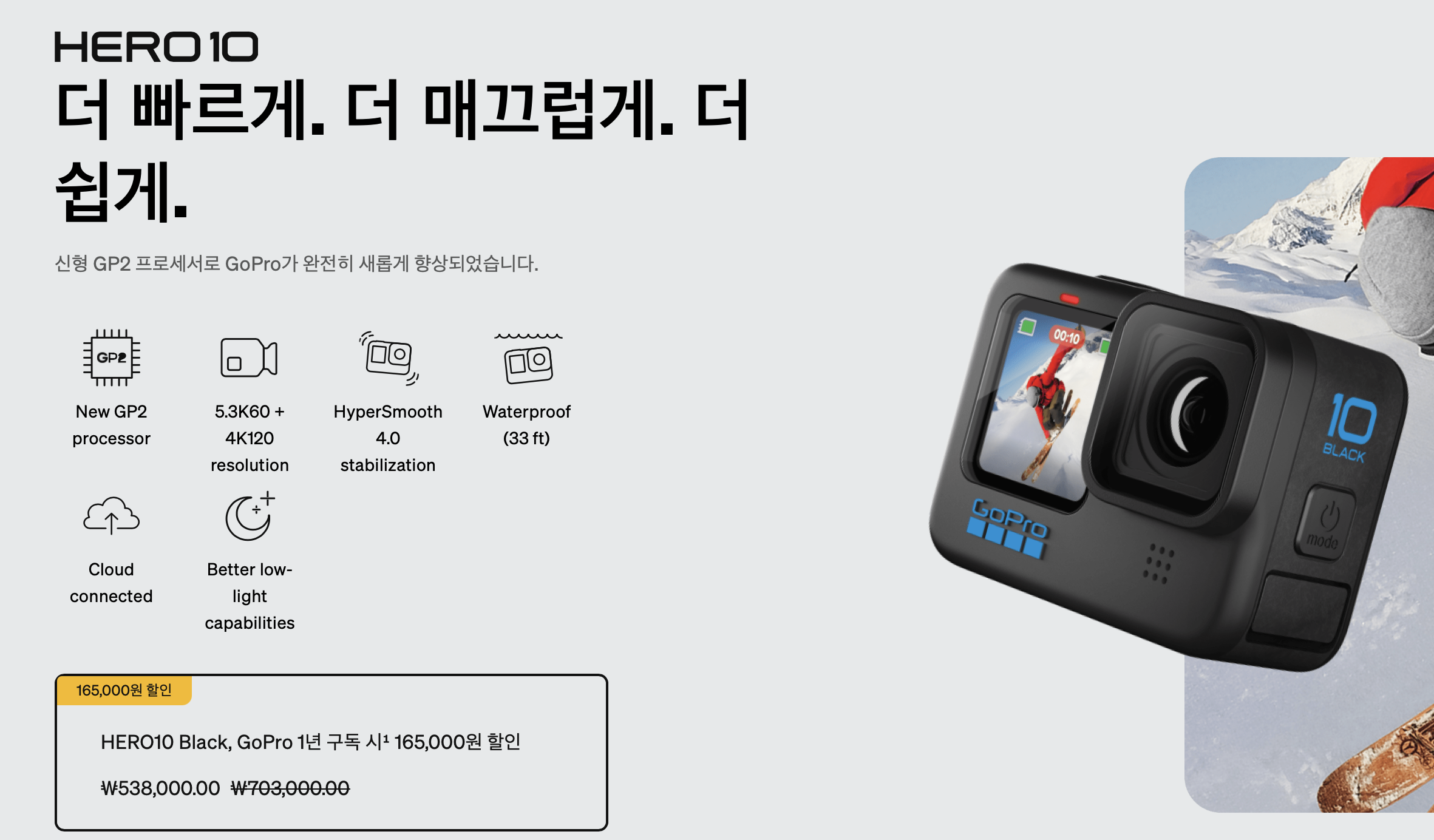 고프로10이 분명 변화는 있었어요. 근데, 굳이 살만한 이유가 있지는 않아보여요. 아이폰12와 아이폰13과 같은 비교랄까요...? 고프로8과 고프로9은 아주 큰 차이(전면디스플레이)가 있었기 때문에 고프로9을 살 가치가 충분했죠. 근데 이번에는 아니에요. 고프로10을 구매하는 돈이면 고프로9을 구매하고 액세서리를 몇 개 더 추가하는게 현명하죠. 마지막으로, 한 달 뒤면 블랙프라이데이 세일을 시작합니다. 고프로는 항상 블랙프라이데이마다 엄청난 딜을 보여주죠. 그때까지 조금만 참았다가 결제하시는 걸 추천드립니다. 고프로9 1년 사용기도 바로 올릴게요~